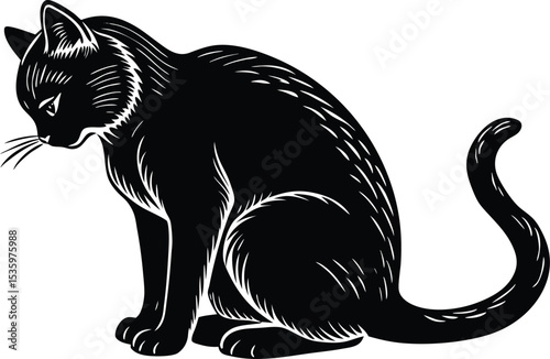 Obraz premium Sitting Black Cat Silhouette Illustration in Vintage Engraved Style