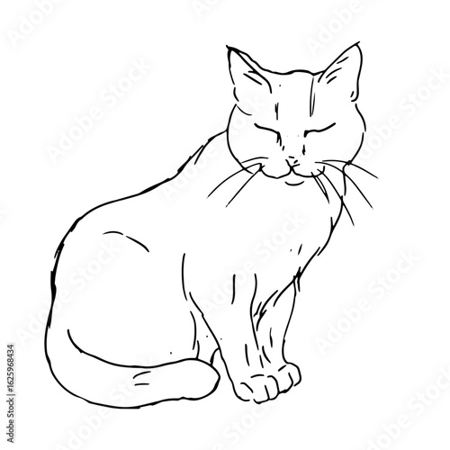 Fototapeta premium Sitting cat, black and white ink sketch. Vector illustration. The silhouette is made in a simple linear style. The theme of animals, veterinary clinics, animal feed and for printing