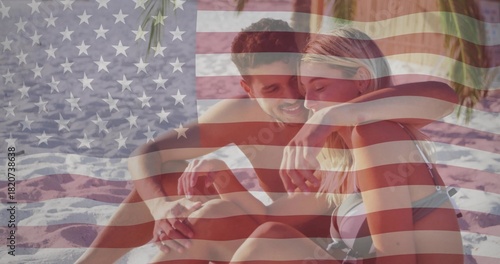 Naklejka premium Sitting couple embracing on rippled sand, wearing bikini top and swim trunks, US flag overlay