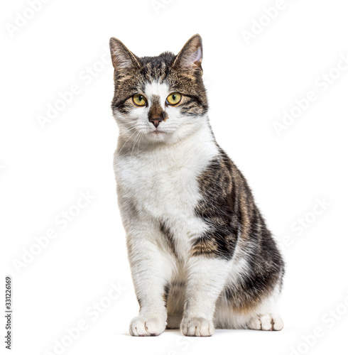 Obraz premium Sitting Crossbreed cat, isolated on white