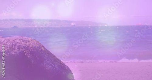 © vectorfusionart, Fototapeta premium Sitting large textured rock on sandy shoreline, with pastel haze over calm sea, copy space