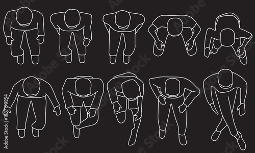 © Hasan, Naklejka premium Sitting men, top view, body postures, resting and reclined, plan, different poses, customizable stroke, vector