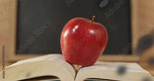 Naklejka premium Sitting red apple balancing on open book on desk in classroom, with chalkboard and chalk dust