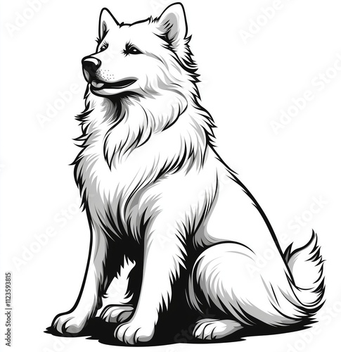 Fototapeta premium Sitting white fluffy dog, monochrome illustration.