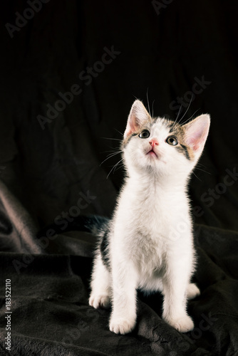 © yommy, Fototapeta premium Sitting white kitten on dark brown blanket