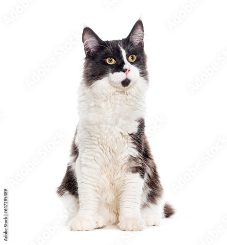 Obraz premium Sitting young Grey and white Mixedbreed cat yellow eyed, isolated on white