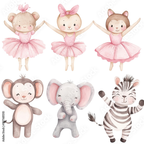 Fototapeta premium Six adorable animal characters in ballet outfits performing joyful dance moves in soft pastel shades.