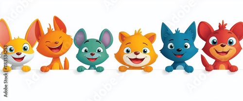 © ABIDZAR ALFAREZ, Naklejka premium Six adorable cartoon animals peeking over a white banner.