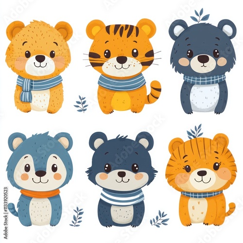 © logyartstudios, Fototapeta premium Six adorable cartoon animals wearing scarves.