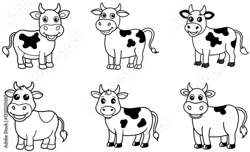 Fototapeta premium Six adorable cartoon cow illustrations in a simple black and white line art style.