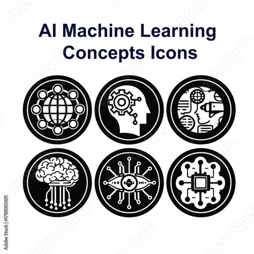 © MDZAHED, Fototapeta premium Six black and white machine learning concept icons