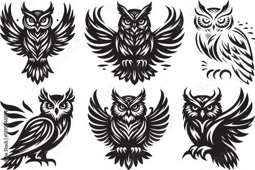 © SaHeD, Obraz premium Six black and white owl illustrations tribal style wings