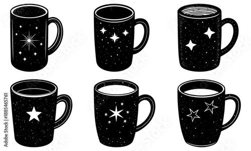 © Lutfor, Obraz premium Six Black Mugs with Star and Constellation on White Background cups stars