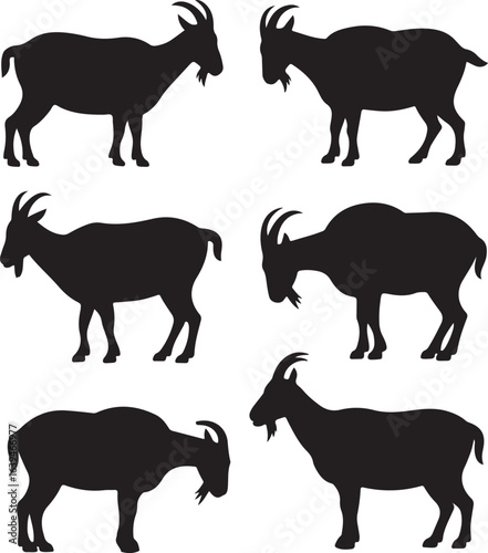 © silhouette verctor, Fototapeta premium Six Black Silhouette Goats Standing and Sitting on White Background animal farm
