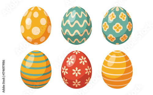 Fototapeta premium Six Colorful Easter Eggs with Unique Patterns on a White Background for...