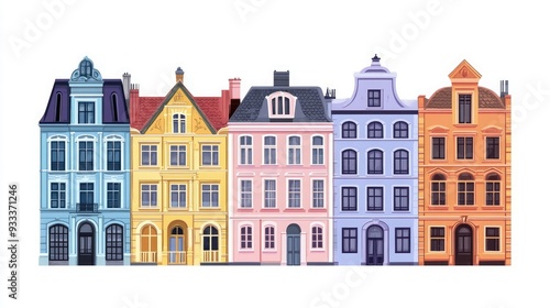 © creative, Fototapeta premium Six colorful, historic townhouses with arched windows, doors, and decorative details.