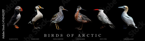 © SNEHIT PHOTO, Obraz premium Six common birds of arctic on black background, poster, Generative AI image.