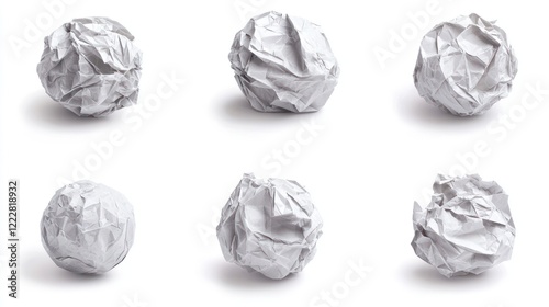 © Sri, Fototapeta premium Six crumpled paper balls displayed on a white background.