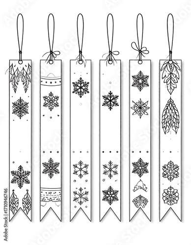 © rondaf, Obraz premium Six decorative bookmarks, featuring repeating winter motifs, including snowflakes and stylized leaves, arranged vertically on a white background.