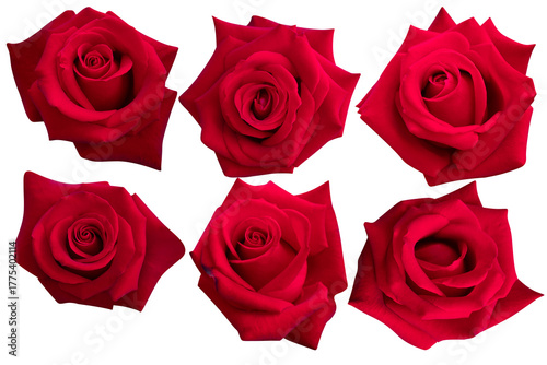 © Nipaporn, Fototapeta premium Six deep red roses are blooming in a long row on a white background.Photo with clipping path.