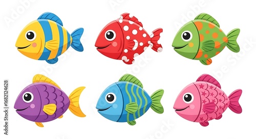 © kurnia, Fototapeta premium Six different funny expresion cartoon fish characters, isolated on white background.