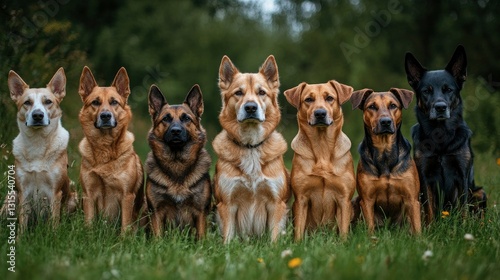 © ACE STEEL D, Obraz premium Six Diverse Dogs Sitting in Grass, Portrait