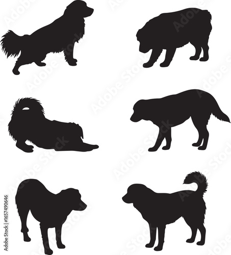 Naklejka premium Six dog silhouettes standing and lying down dogs black