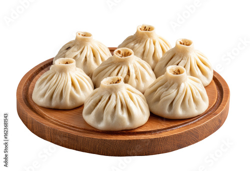 © Muhammad, Obraz premium Six dumplings, light beige color, on a round wooden platter