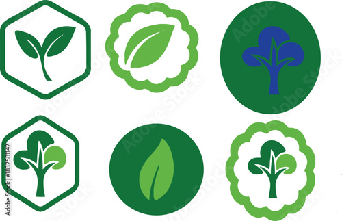 Obraz premium Six green and blue nature plant and tree icons on white background vector