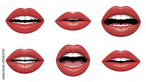 Fototapeta premium Six illustrations of red lips in different positions, some showing teeth and...