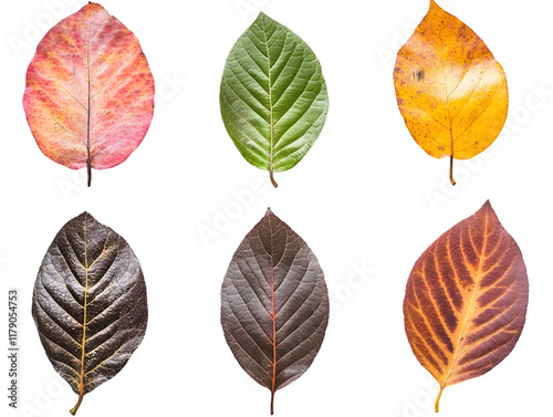© CrystallineCreative, Fototapeta premium Six Leaves Showing Stages of Autumnal Color Change Isolated On A White Background, PNG Transparent