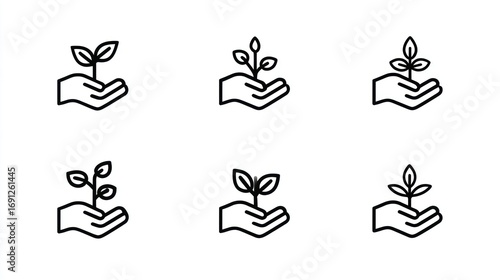 Naklejka premium Six line art hand icons holding a plant seedling, arranged in a two-row grid