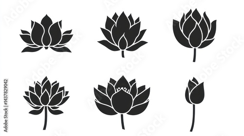 Obraz premium Six lotus flower silhouettes; various bloom stages; white background; for design