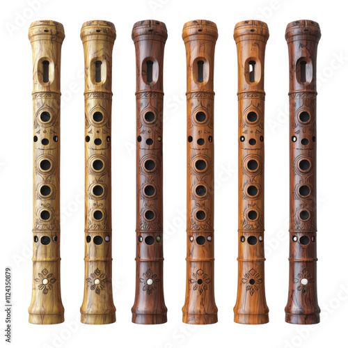 Naklejka premium Six Ornate Wooden Flutes Musical Instruments Folk Music Woodwind