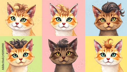 © Prasert, Fototapeta premium Six-panel digital artwork, each panel features a cat with a unique, exaggerated hairstyle, bright solid background colors, whimsical and lighthearted mood