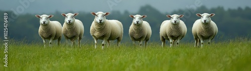 Fototapeta premium Six Sheep Standing in a Green Field