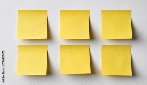 © Yaury, Fototapeta premium Six square yellow sticky notes arranged in a grid pattern on a plain white surface