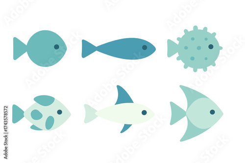 Fototapeta premium Six stylized marine life fish shapes in simple flat graphic design