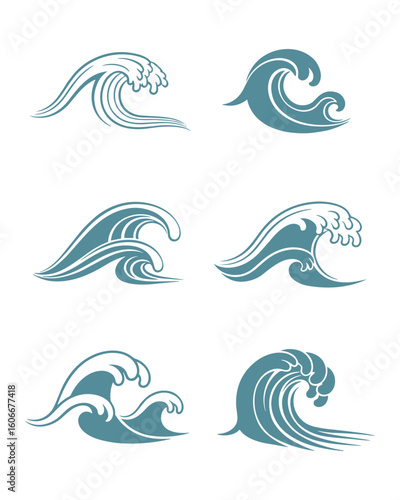© MVectors, Fototapeta premium Six Stylized Sea Waves with Foam Design Set, Marine Blue Color, Isolated Nautical Elements, Vector Illustration