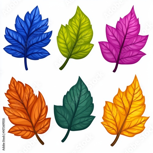 © Sakkarin, Obraz premium Six vibrant leaves in various colors against a white background. Each leaf displays intricate details and unique hues, ranging from deep blues and greens to bright oranges and pinks.