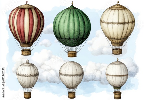 © Kettisak, Obraz premium Six Vintage Hot Air Balloons in a Light Blue Sky with Clouds