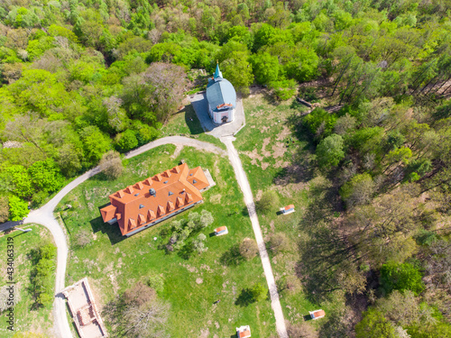 © pyty, Fototapeta premium Skalka Baroque complex with church of St Mary Magdalene and Stations of the Cross. Mnisek pod Brdy, Czech Republic. Aerial view from drone.