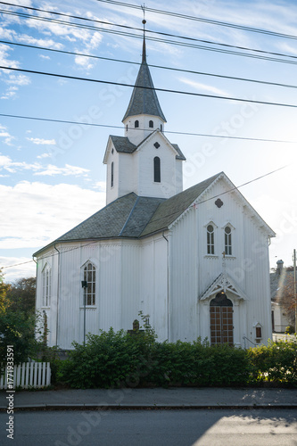 Fototapeta premium Skare Church, Haugesund, Norway, quaint white church with a pointed steeple...