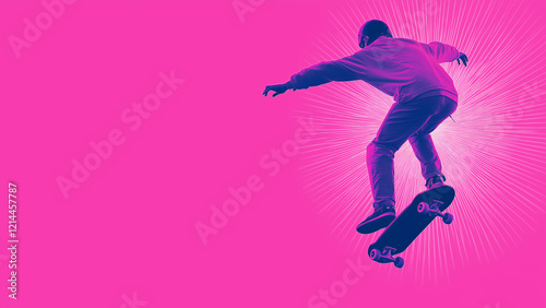 Naklejka premium Skateboarder jumping with his skateboard on a vibrant duotone background