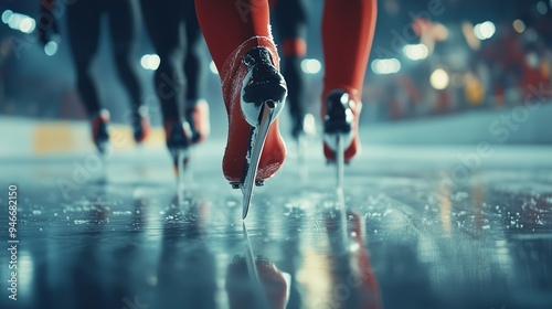 © fotofabrika, Fototapeta premium Skaters gliding on the ice during a competitive event in an indoor rink in the evening, showcasing athleticism and speed