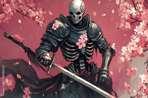 © Woranuch, Naklejka premium Skeletal Knight Amidst Falling Cherry Blossoms.