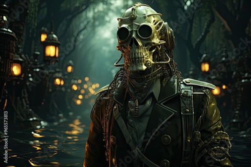 © VenDigitalArt, Fototapeta premium skeletal steampunk pirate, boats in background