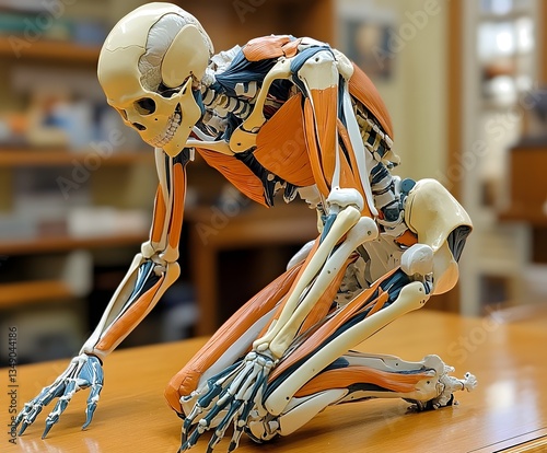 Fototapeta premium Skeleton Anatomy Study: A detailed anatomical model of a human skeleton, showcasing the intricate structure of bones, muscles, and ligaments.