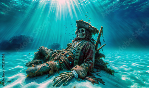 Fototapeta premium Skeleton bones of a dead pirate captain resting at the bottom of the sea with sunrays filtering through the ocean