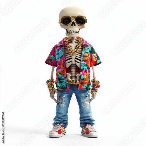 Fototapeta premium skeleton dressed in a colorful Hawaiian shirt, denim jeans, and sneakers, with a gold chain necklace, isolated on a bright white background